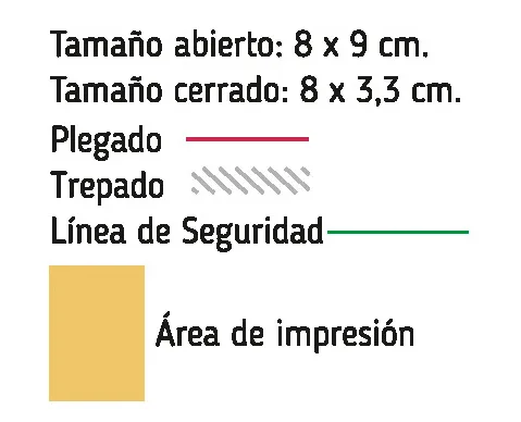 El boleto tiene un tamaño abierto de 8 x 9 cm y cerrado de 8 x 3,3 cm.